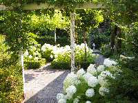 soort patio waarin buxusvakken gevuld met Hydrangea arborescens
